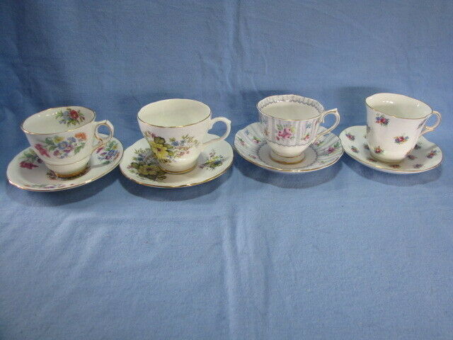 ENGLISH BONE CHINA LOT 4 TEA CUPS & SAUCERS-VARIETY FLORAL