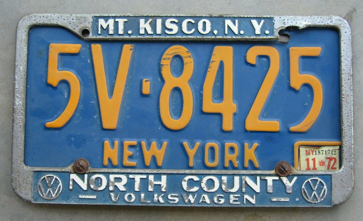 Title (ebay affiliate link): 1972 New York License Plate (#5V-8425) With Mt. Kisco NY Volkswagen Frame (VW)