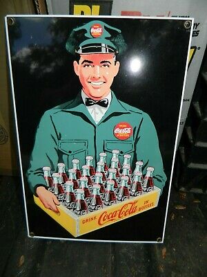 Title (ebay affiliate link): Ande Rooney Porcelain Enamel Coca Cola Sign Driver Holding Crate 1991 Nice Piece