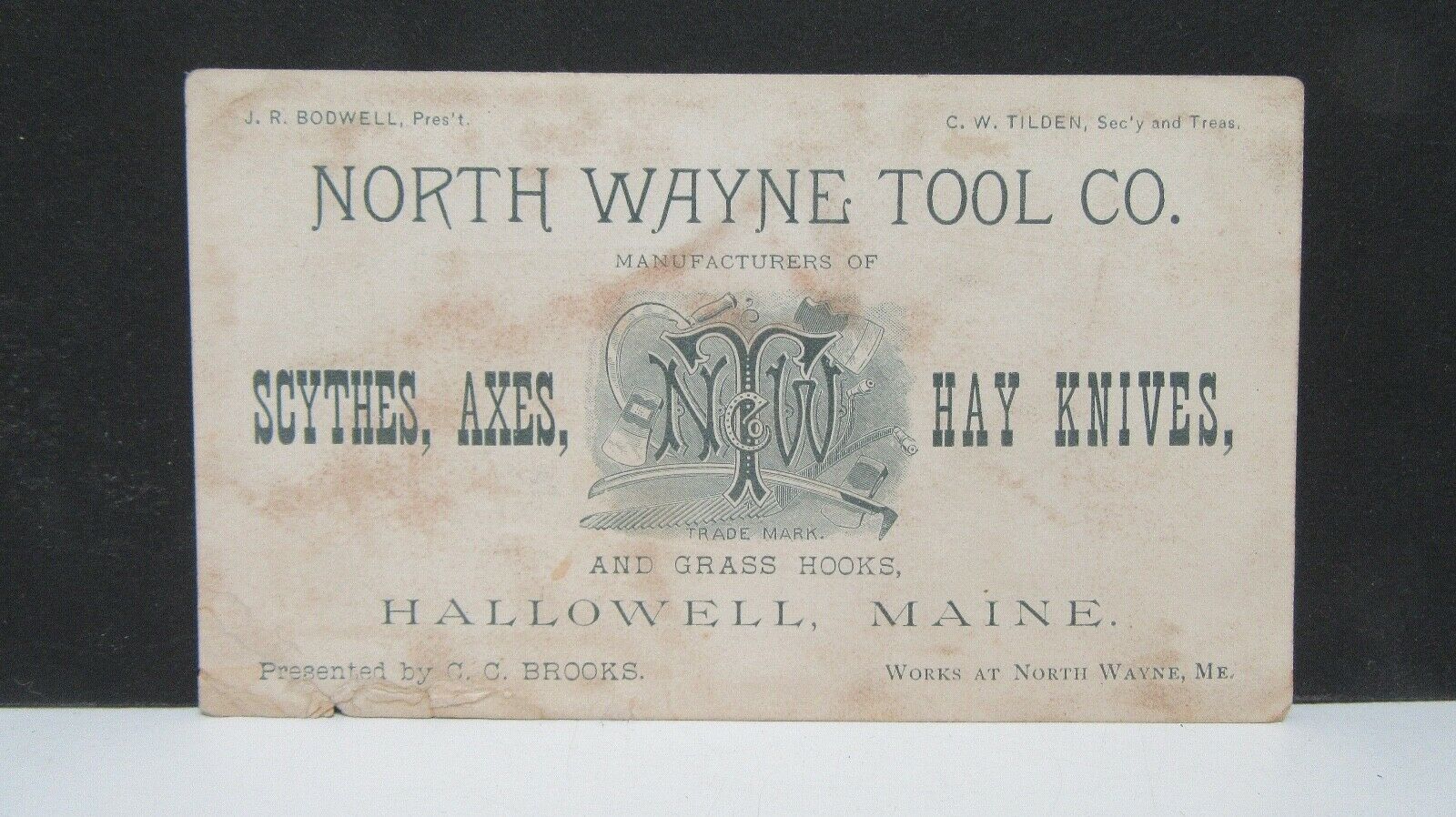 Advertisement, North Wayne Tool Co. Scythes, Axes, Hay Knives, Hallowell, Maine