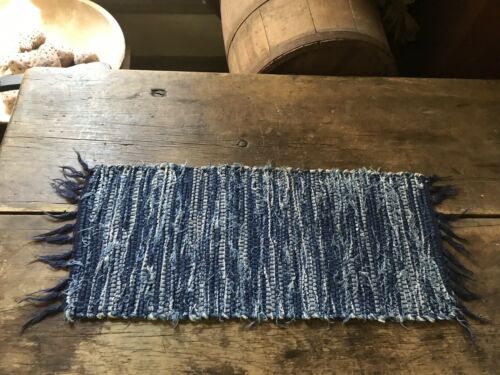 Long Old Indigo Blue Rag Rug Table Mat Runner Country Textile AAFA