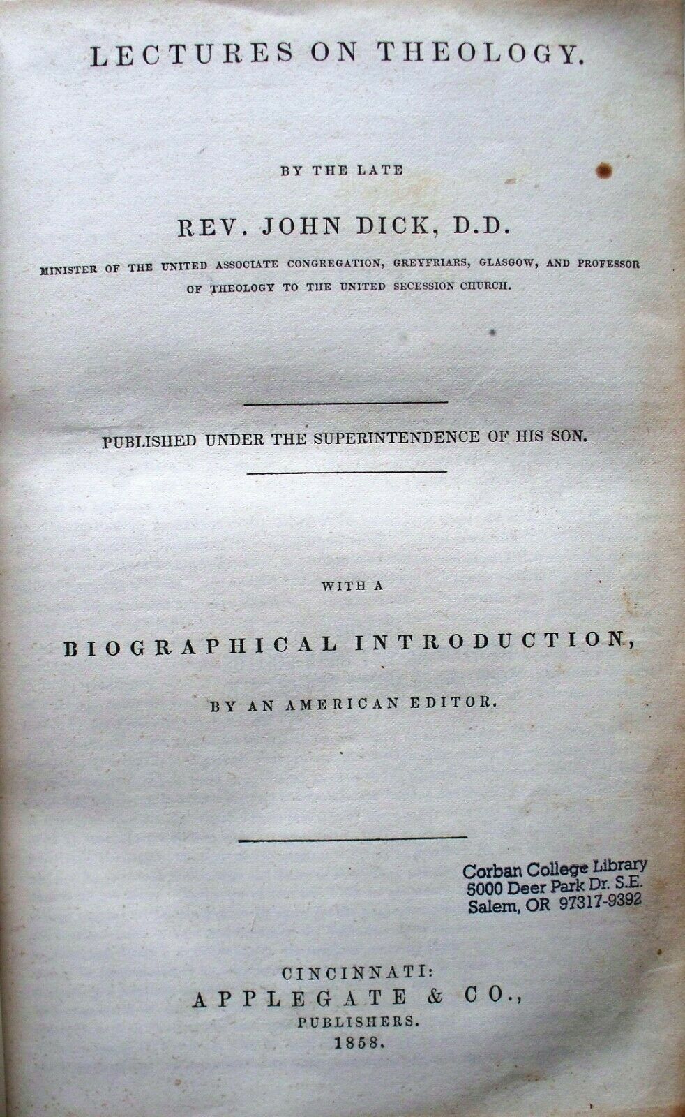 Title (ebay affiliate link): John Dick - Theology Lectures - 1858 - 573 pp HARDBACK - Reformed Calvinist