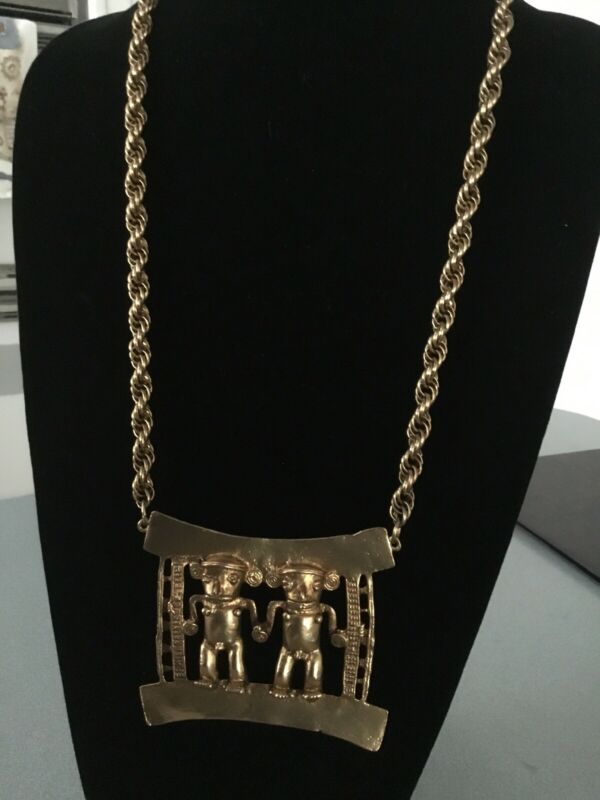 Title (ebay affiliate link): LARGE FAUX TUMBAGA PRECOLUMBIAN FIGURAL PECTORAL MEDALLION NECKLACE MOVIE PROP