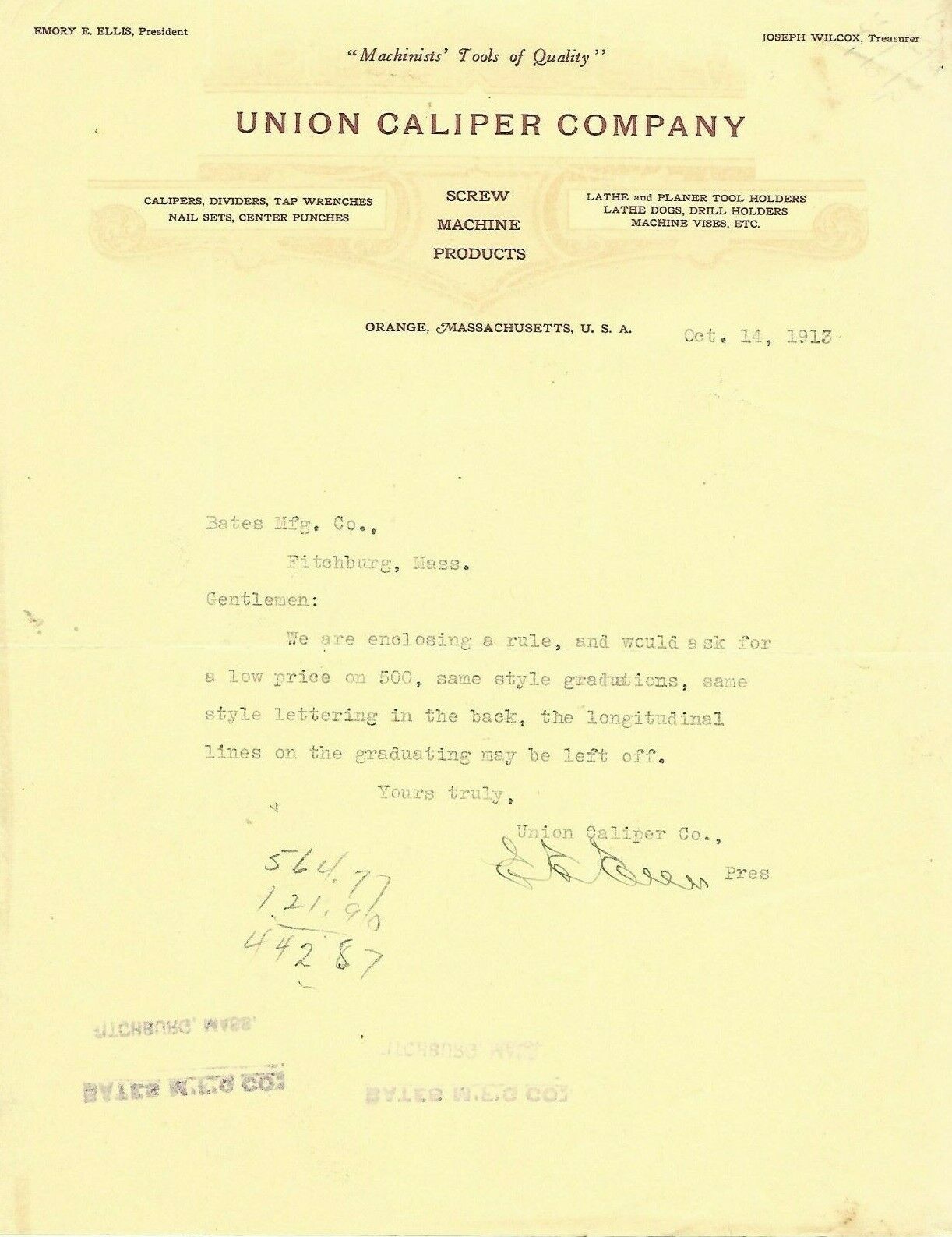 1913 Letter, Union Caliper Co., Tools, Calipers, Machine Products, Orange, Mass.