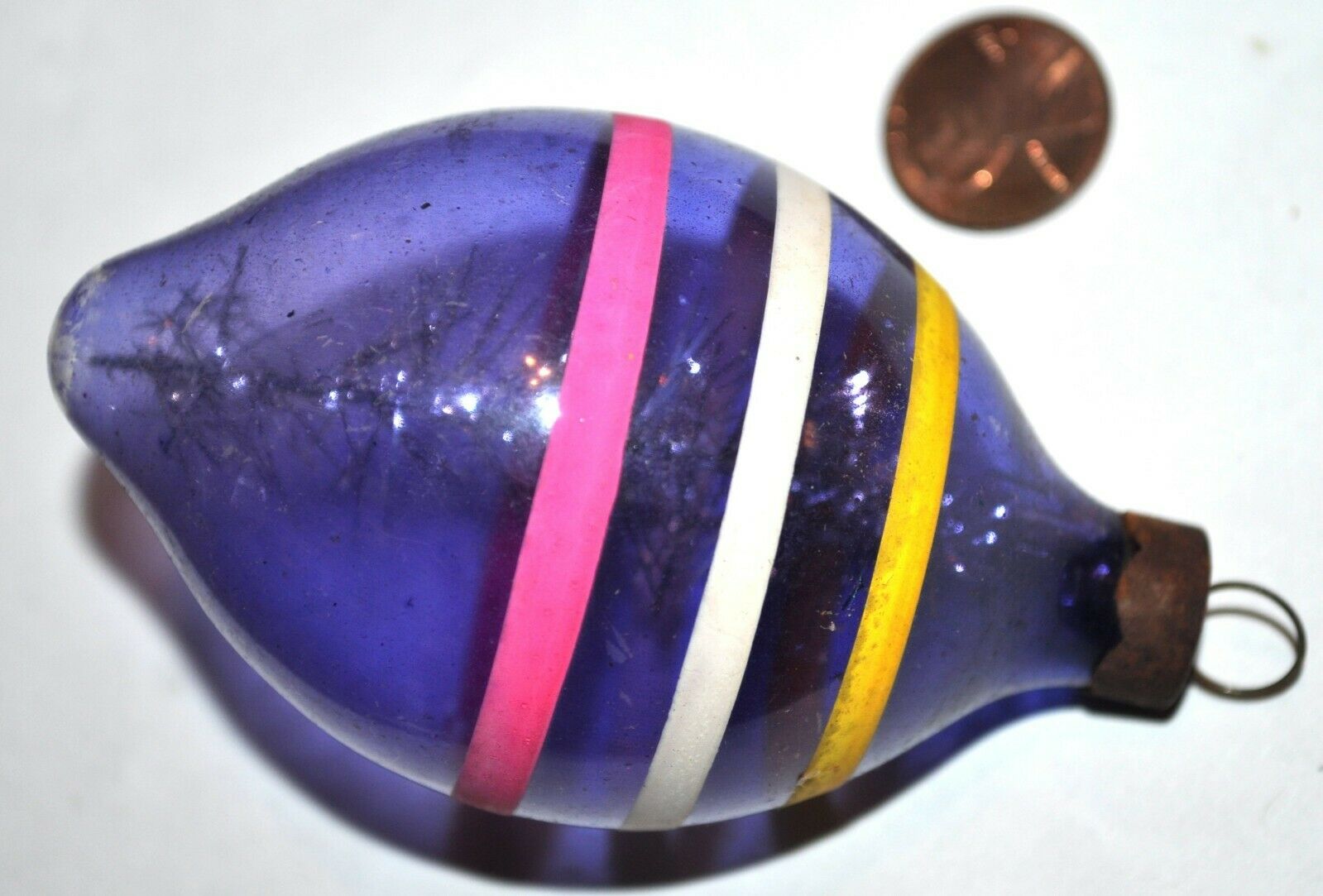 VINTAGE 1940s WAR-ERA unsilvered w/ TINSEL striped-tear-shape CHRISTMAS ORNAMENT