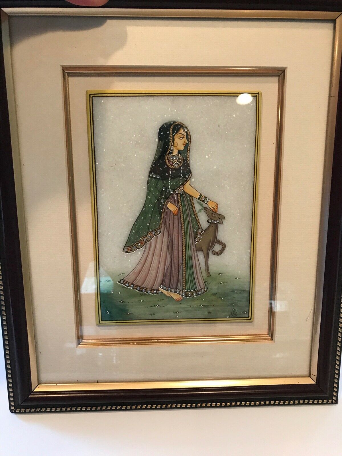 Title (ebay affiliate link): Vintage Tile from India Depicting Women & Dog?/ Deer? Framed Art Tile