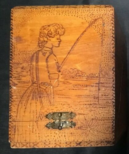 Title (ebay affiliate link): Antique Pyrography Box, Victorian Lady Fishing Scene, Unique Wave Opening