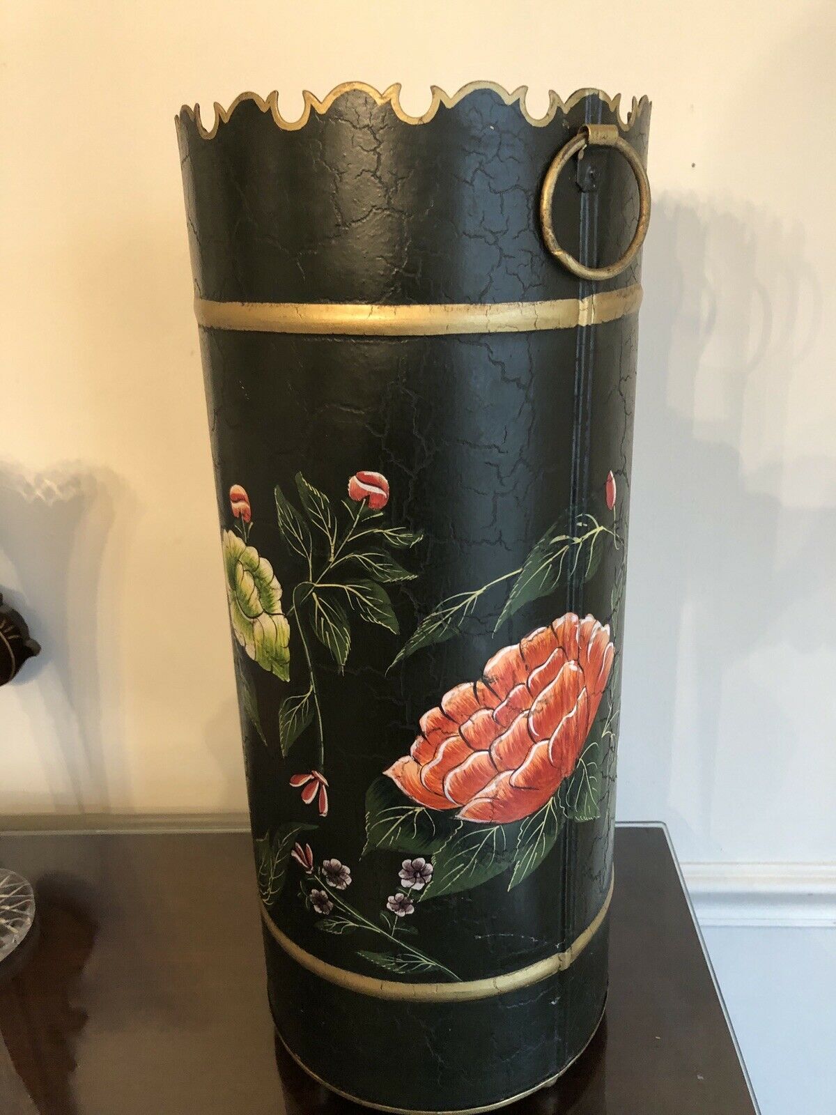 Vintage Toleware Hand Painted Umbrella Stand with Gold Trim