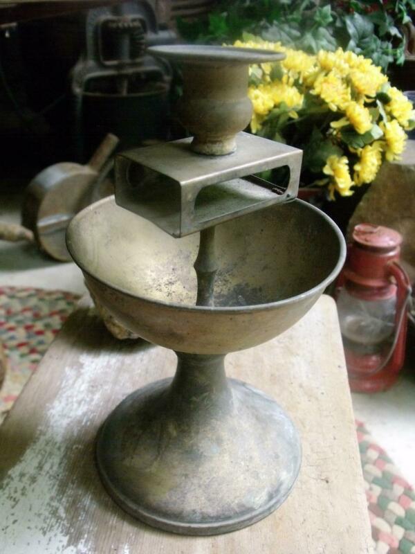 Primitive Antique Brass Candlestick With Match Box Holder Weighted Base PATINA!
