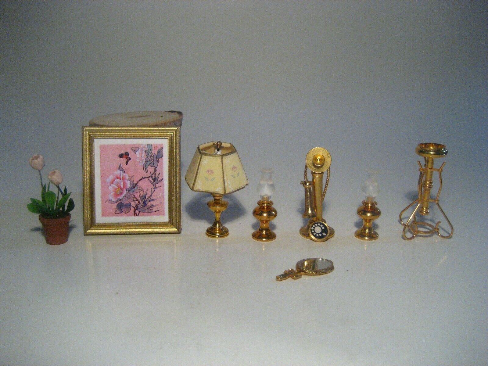 VINTAGE DOLLHOUSE FURNITURE LAMPS PHONE PLANT PICTURE MIRROR MIXED LOT OF 8