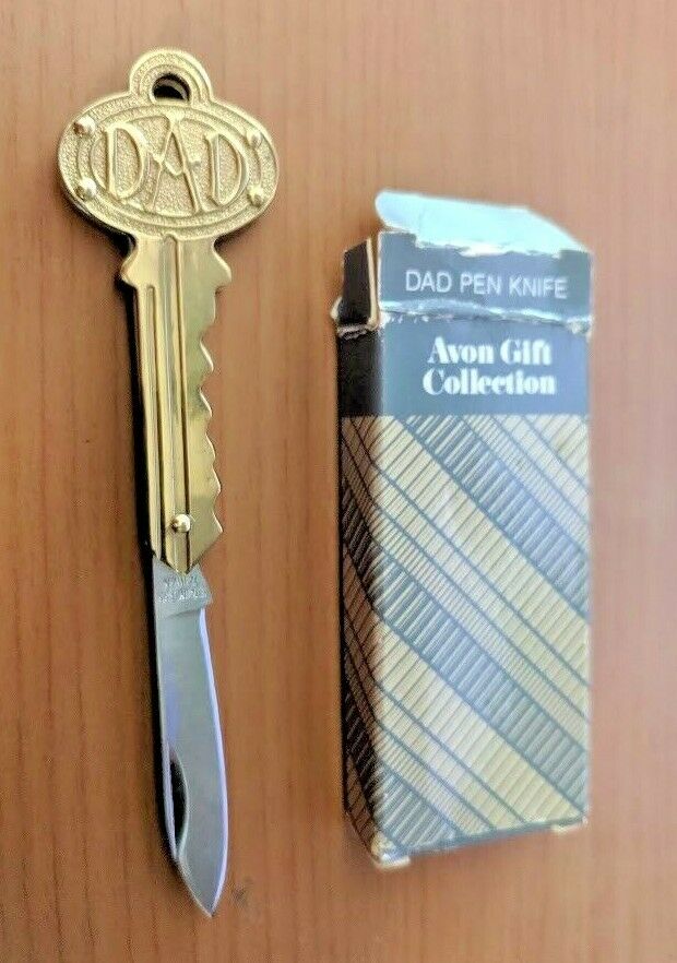 New in the box Avon VINTAGE BRASS " DAD " POCKET KNIFE STAINLESS BLADE KEY CHAIN