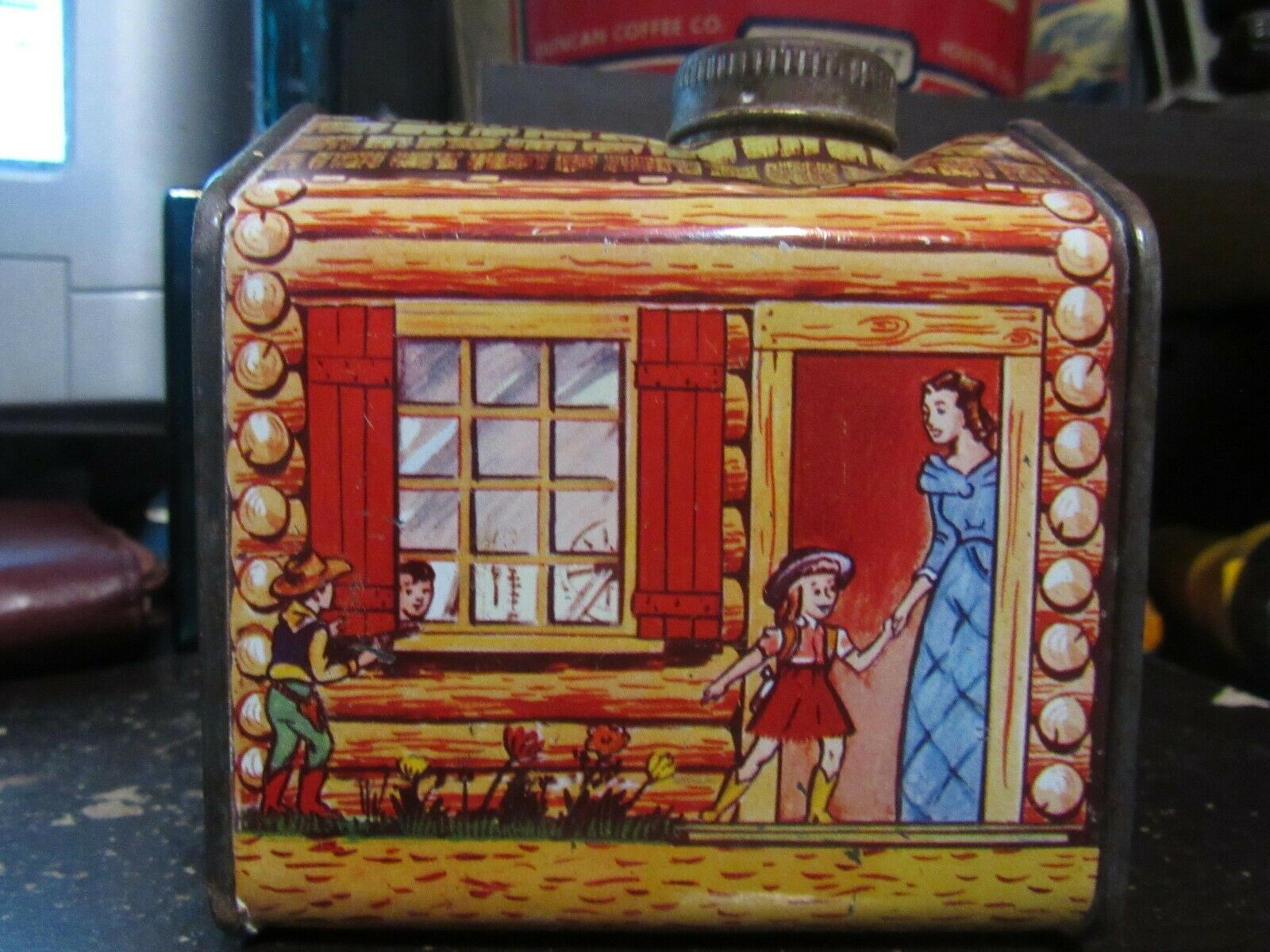 Title (ebay affiliate link): Towles Log Cabin Vintage 1940s Western Log Cabin Design Small 12oz Syrup Tin Can
