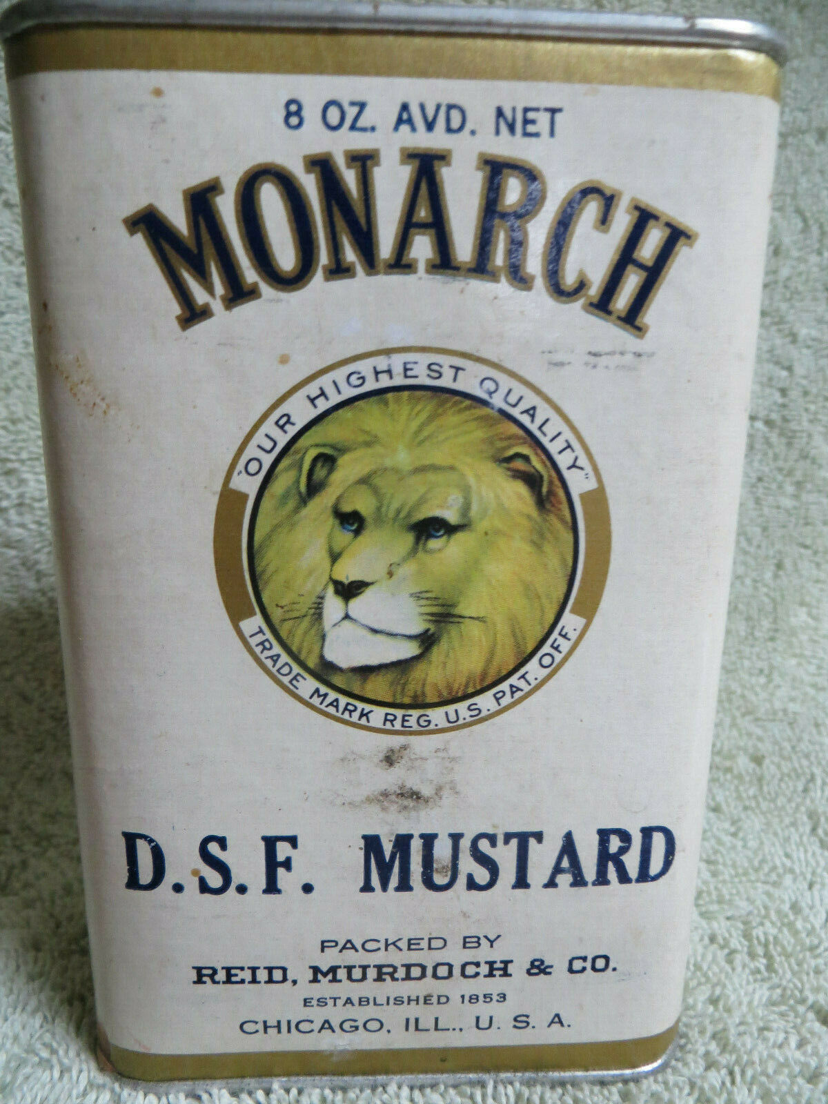 Title (ebay affiliate link): LARGE VINTAGE MONARCH BRAND 8oz DSF MUSTARD SPICE TIN WITH LION