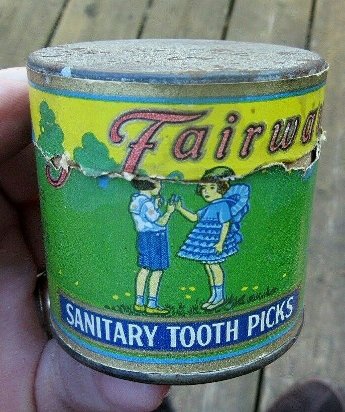 Title (ebay affiliate link): VINTAGE VERY RARE FAIRWAY BRAND WITH CHILDREN TOOTHPICK TIN SPICE TIN