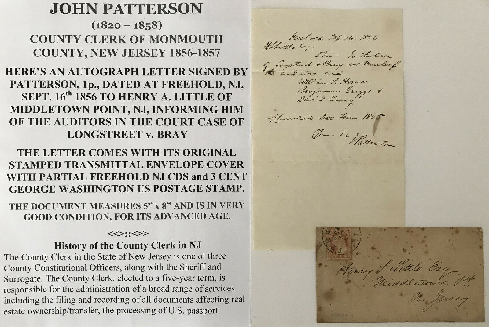 COUNTY CLERK OF MONMOUTH COUNTY NEW JERSEY 1856-1857 LETTER SIGNED ALS & COVER