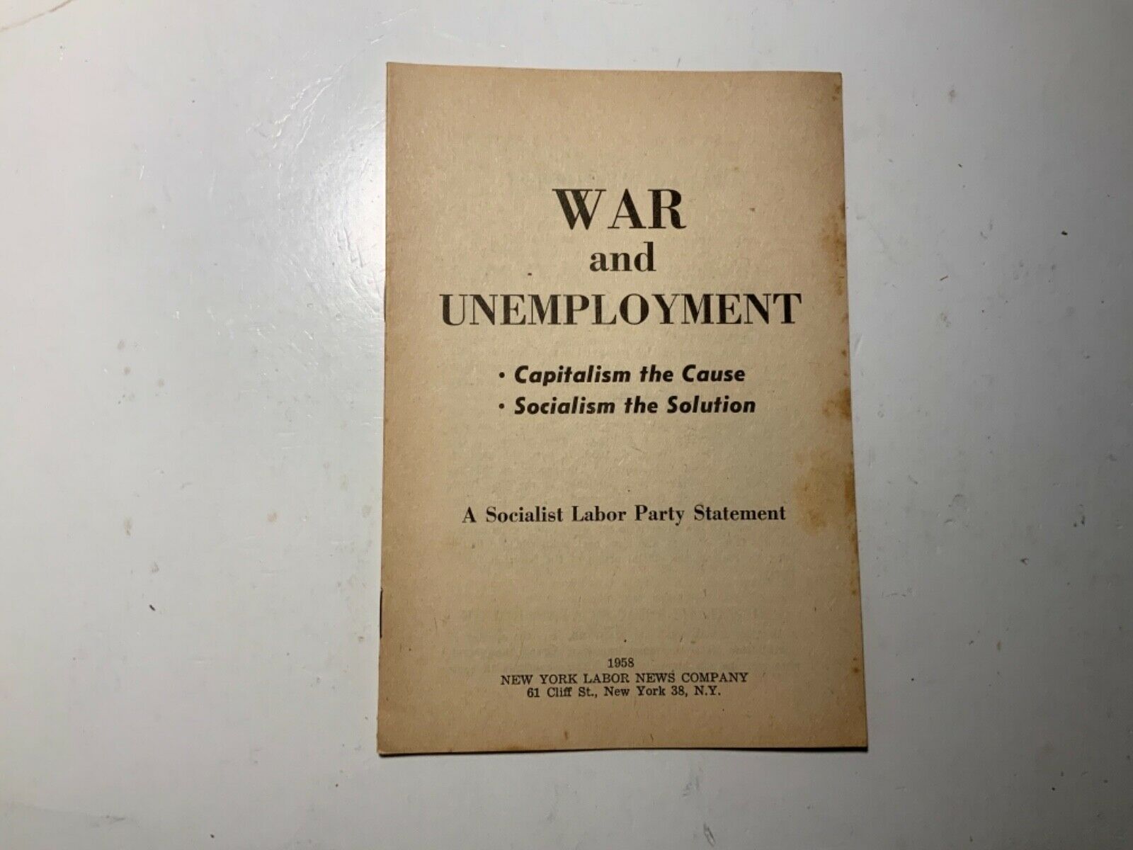 Title (ebay affiliate link): 1958 War And Unemployment, A Socialist Labor Party Statement booklet