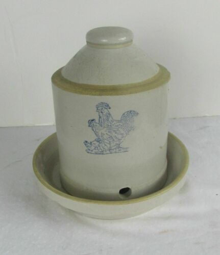 Vtg Stoneware Chicken Water/Feeder/Waterer Blue Chicken Crock With Base