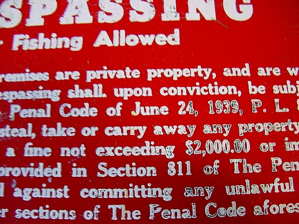 Title (ebay affiliate link): 1939 Vintage PRIVATE PROPERTY NO TRESPASSING HUNTING OR FISHING Old Metal Sign