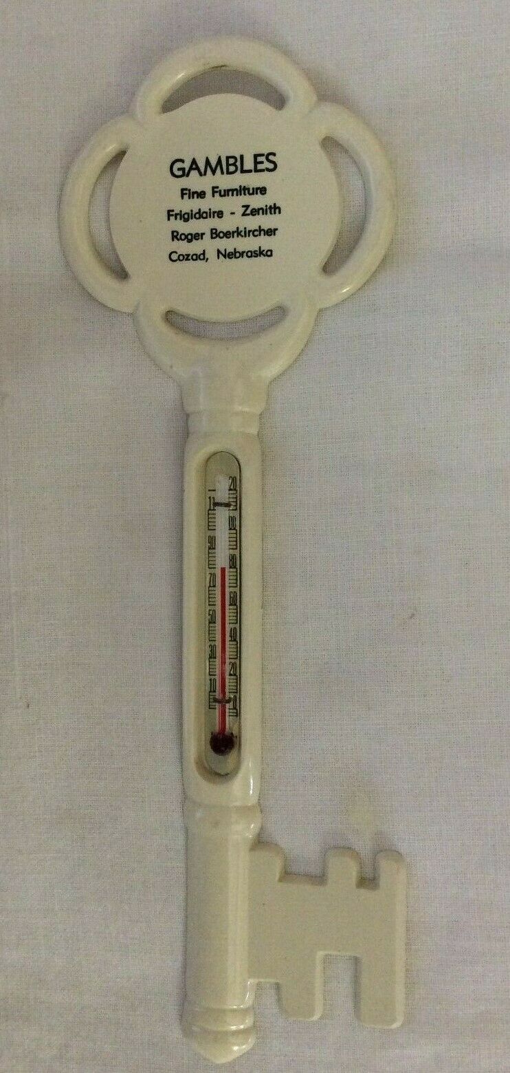 VINTAGE PLASTIC KEY THERMOMETER GAMBLES COZAD NEBRASKA
