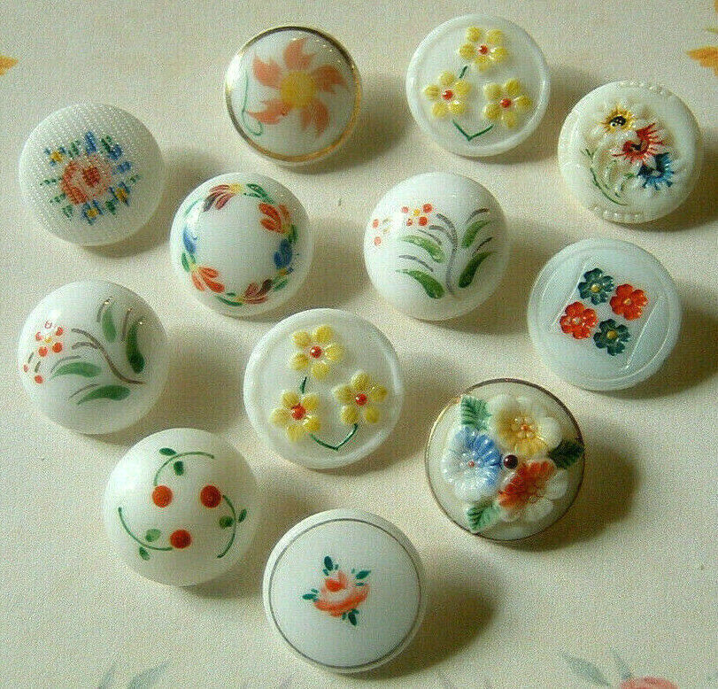 Title (ebay affiliate link): Lot of 12 Lovely Vintage Milk Glass Buttons w/Painted Flowers 11/16"-3/4"