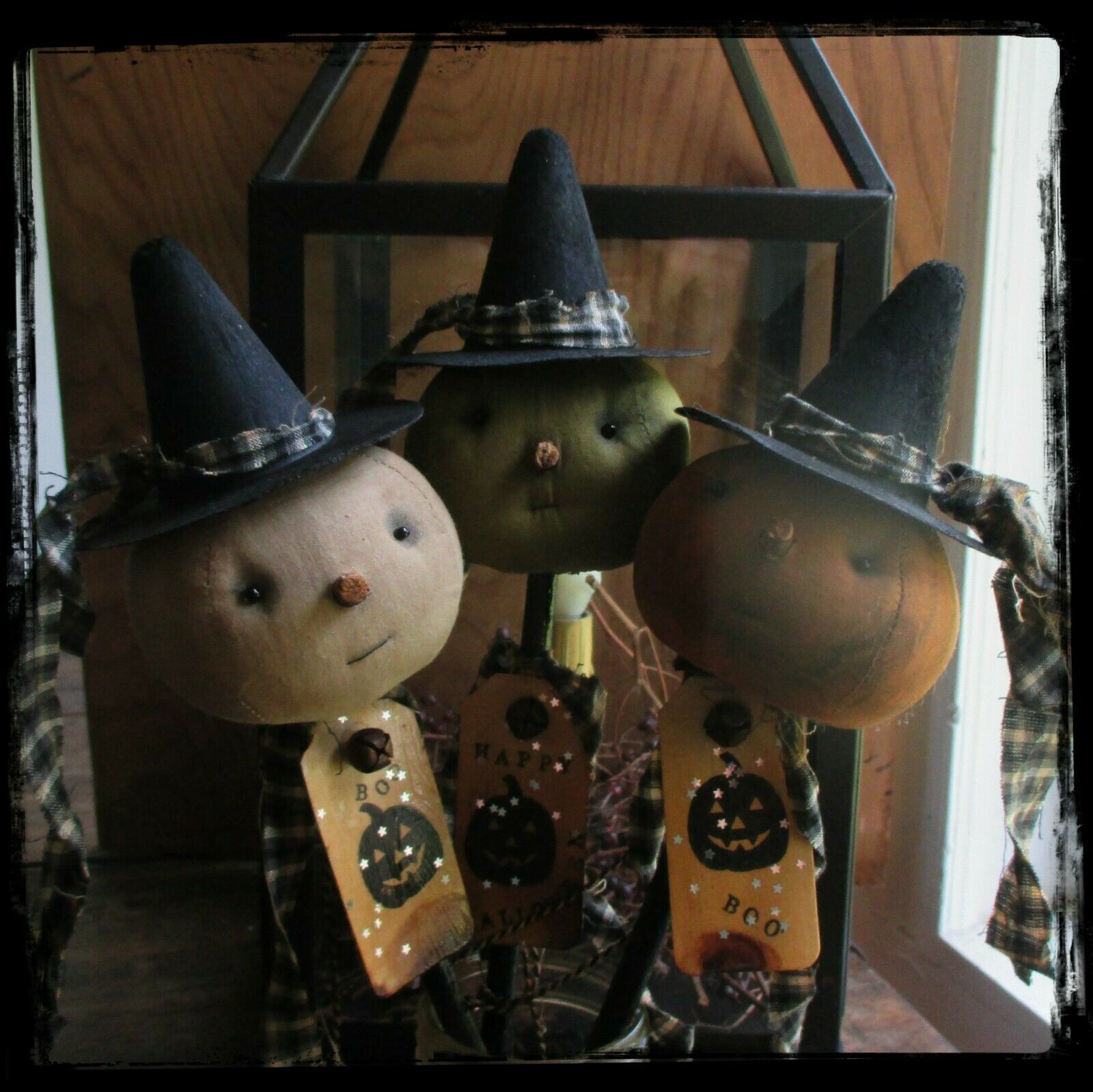 3 Primitive Witch Halloween Harvest Fall Pokes Noisemakers Doll Ornies Make-Do
