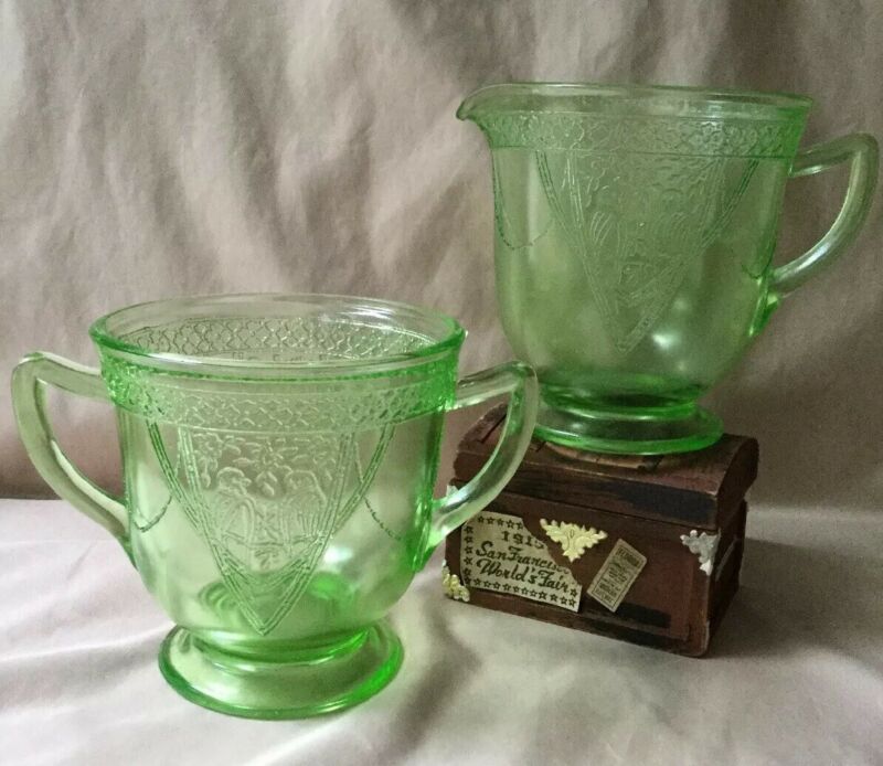 Vintage Depression Uranium Green Sugar Bowl Creamer Lovebirds Federal Glass Co
