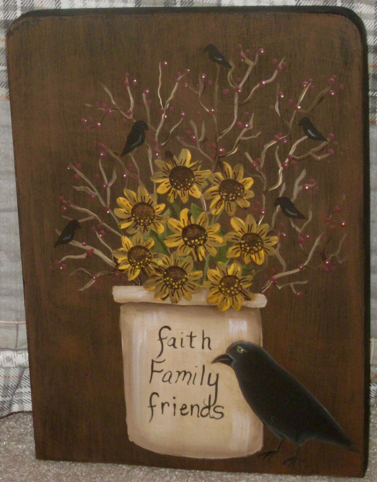 Title (ebay affiliate link): *~*PRIMITIVE*~* HP FOLK ART PRIM CROCK *~* SUNFLOWERS *~* CROW *~* RECLAIM WOOD