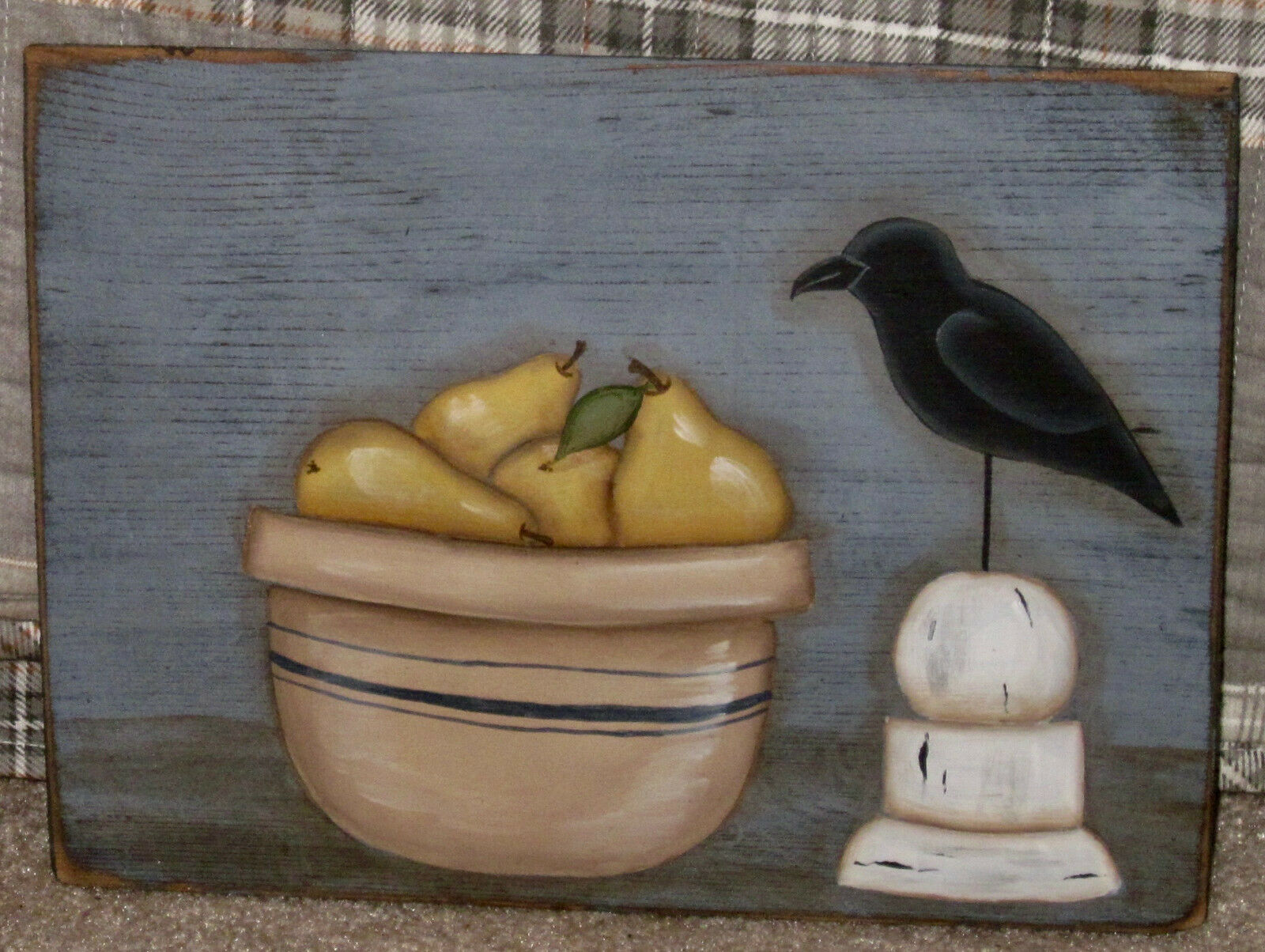 *~*PRIMITIVE*~* HP FOLK ART PRIM CROW ON A PEDESTAL *~* BOWL OF PEARS *~* BOARD