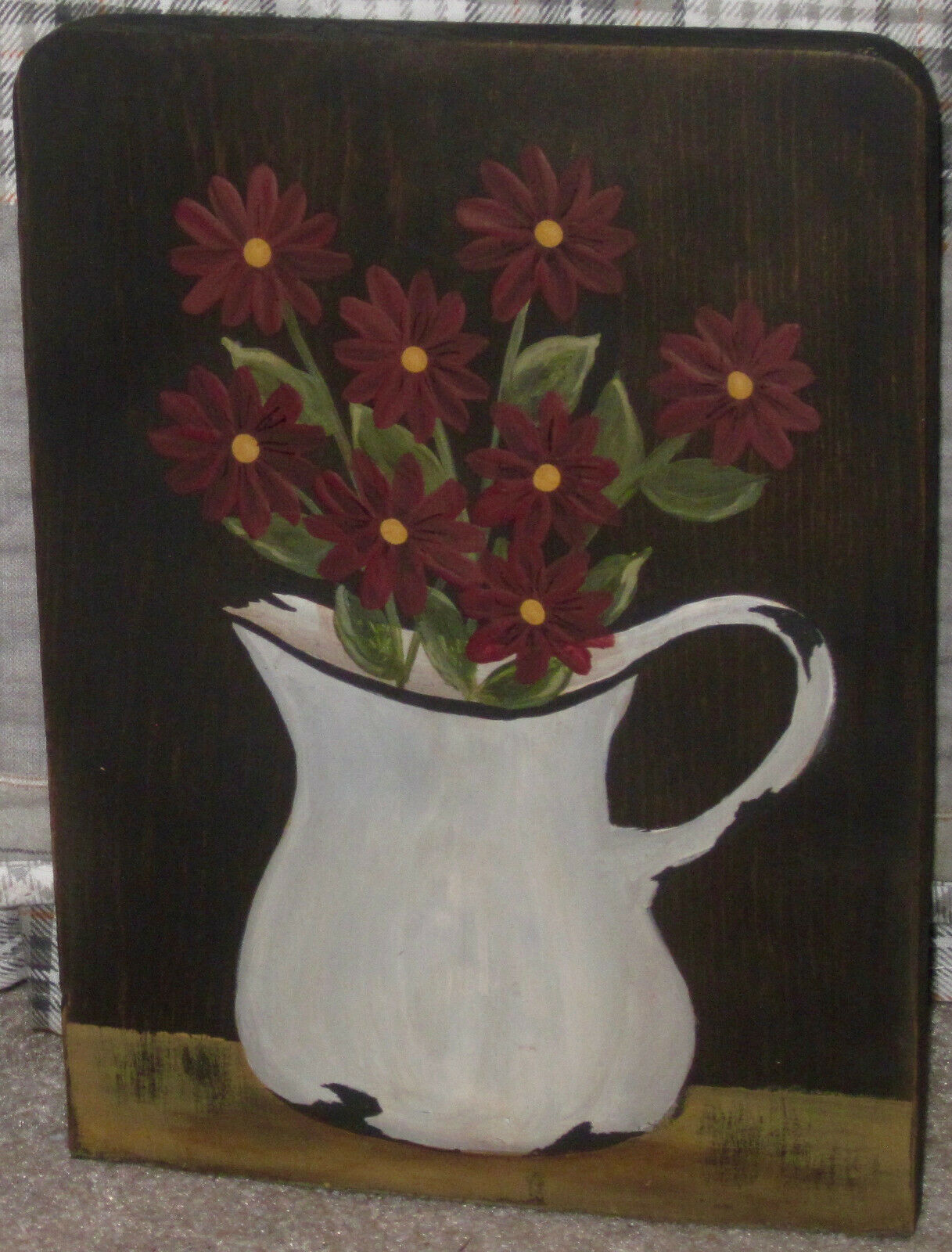Title (ebay affiliate link): *~*PRIMITIVE*~* HP FOLK ART PRIM ENAMELWARE PITCHER OF DAISIES *~* RECLAIM WOOD