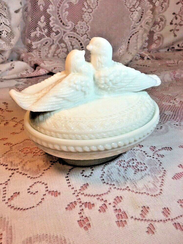 Title (ebay affiliate link): Vintage Westmoreland Milk Glass 2 Love Birds Sitting on Nest Covered Dish