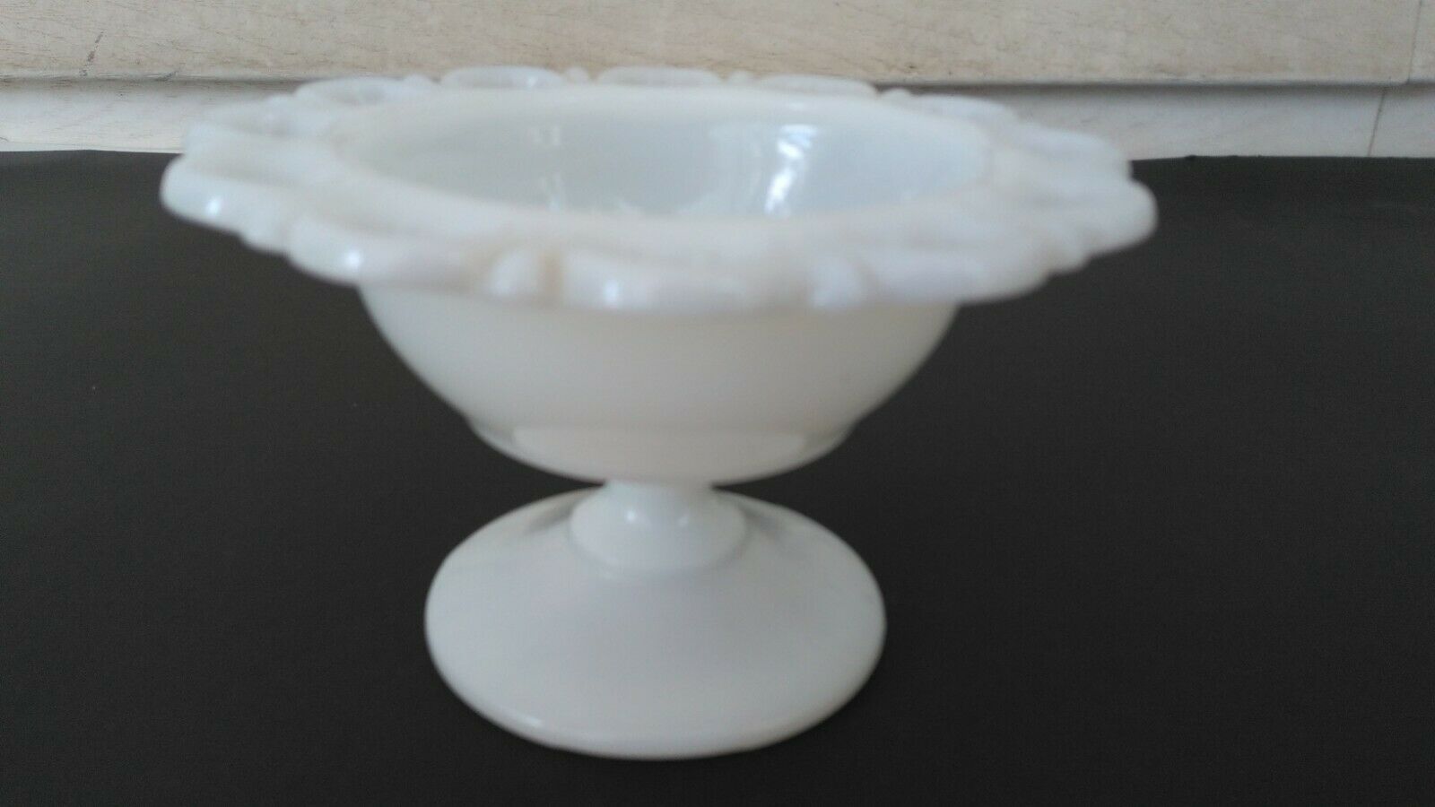 Title (ebay affiliate link): White Milk Glass Pedestal Bowl Small Open Lace Edge Footed Vintage 5"x3