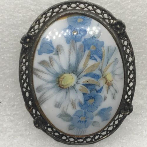 Title (ebay affiliate link): Vintage DAISY BLUE FLOWER CAMEO BROOCH Pin Pendant Oval White Milk Glass Jewelry