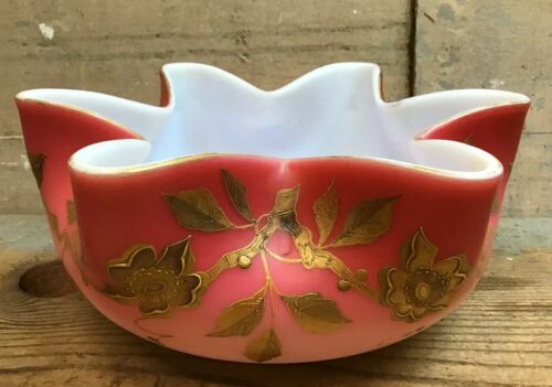 Antique Gold Leaf Apple Blossom Pattern Satin Glass Bowl Crimped Edge Red / Pink