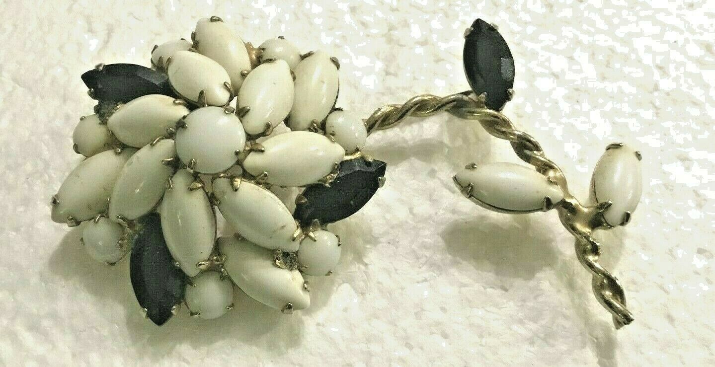 Title (ebay affiliate link): Vintage White Milk Glass and Black Rhinestone Flower Brooch Pin
