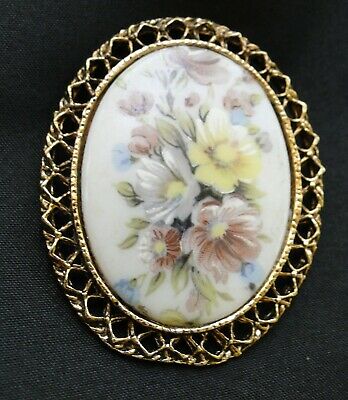 Vintage Milk Glass Handpainted Flowers Floral Oval Gold Brooch Pin EUC