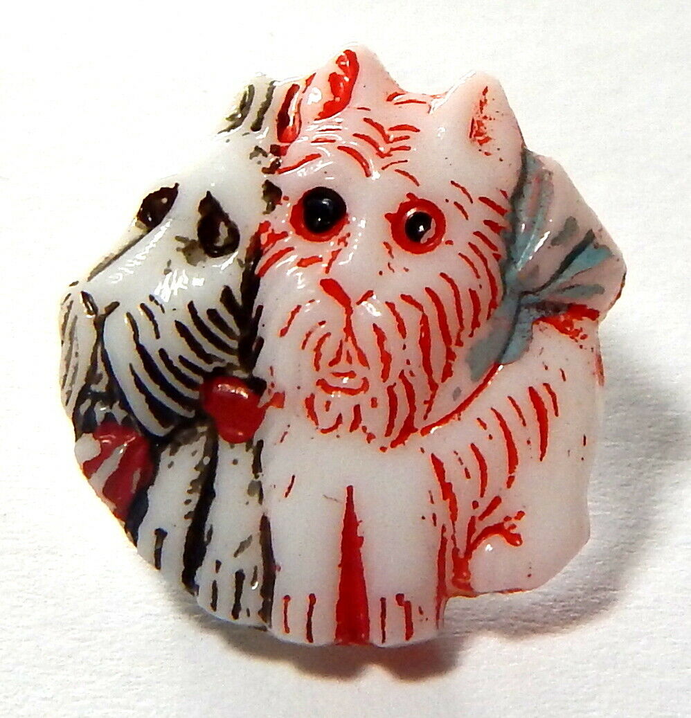 SUPER ADORABLE 1940''S REALISTIC MILK GLASS BUTTON w/RED & BLACK SCOTTY DOGS