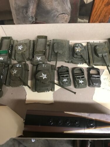 Title (ebay affiliate link): 10 Vintage Hand Crafted Wood Wooden Toy Military Trucks & Cannon 1940s Folk Art