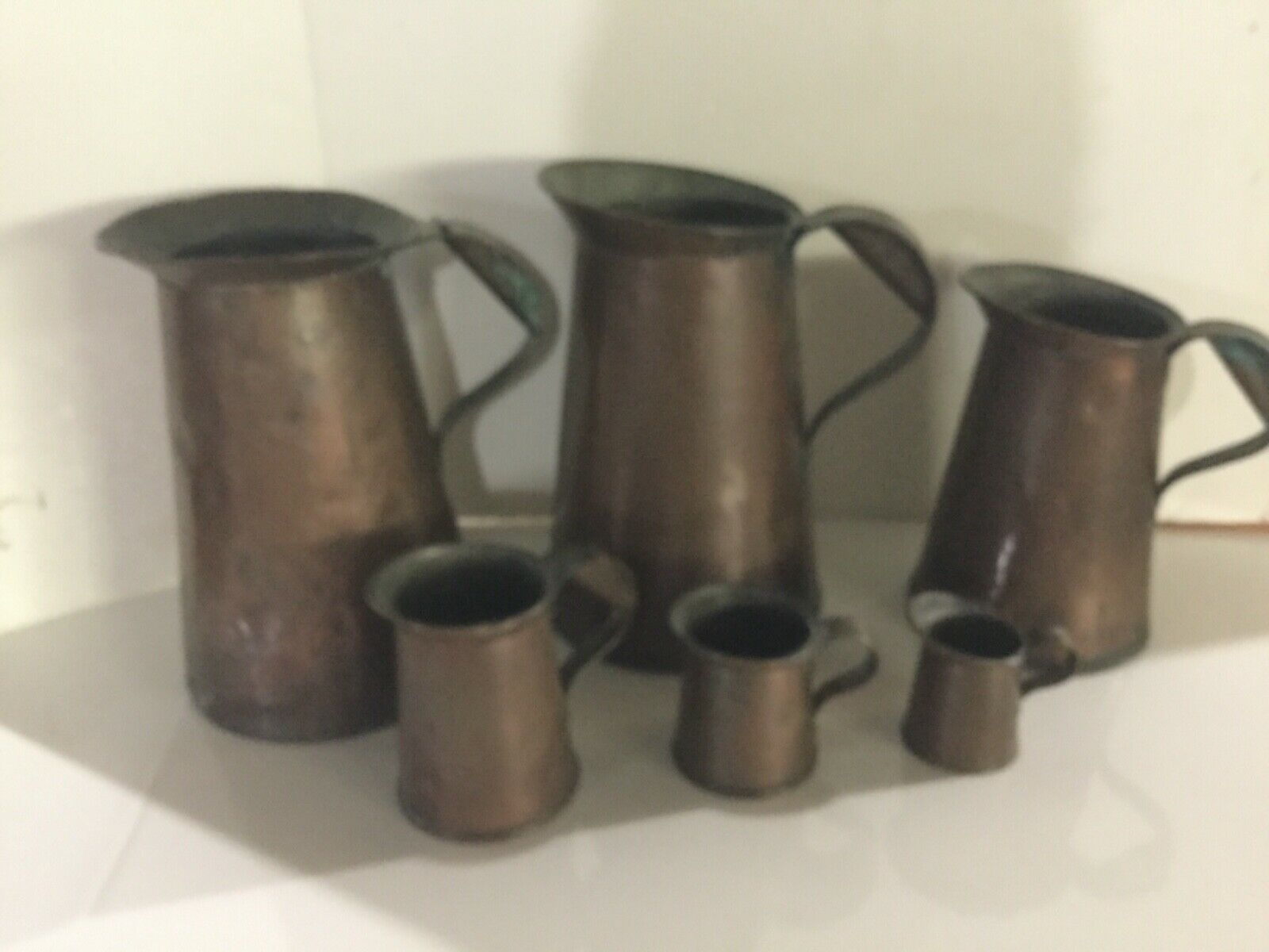 Antique Copper Measuring Pitchers, set of 6.