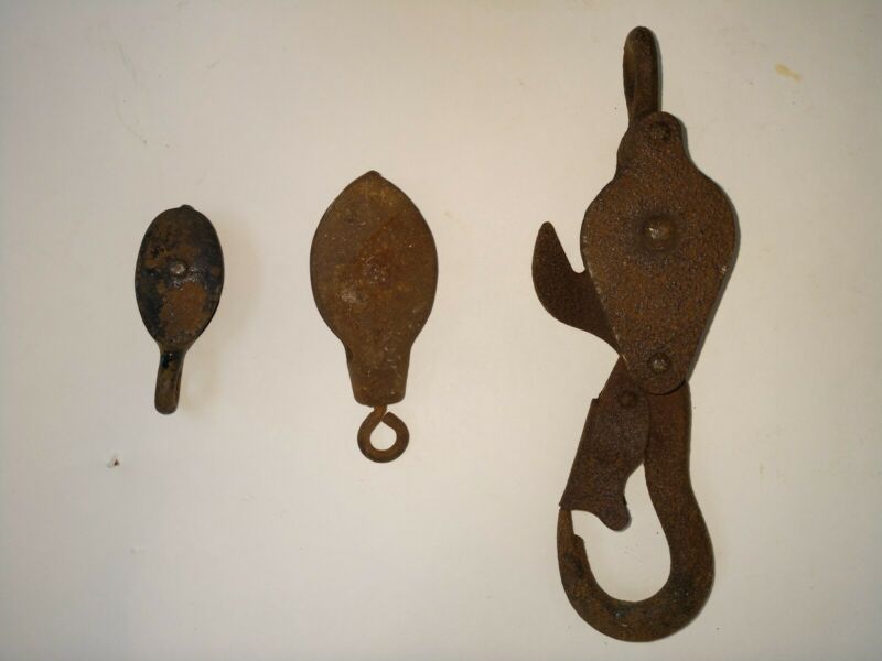 Title (ebay affiliate link): Lot of 3 Antique Metal Farm Pulleys - 7.5" 3.5" 2.5" All Working Condition