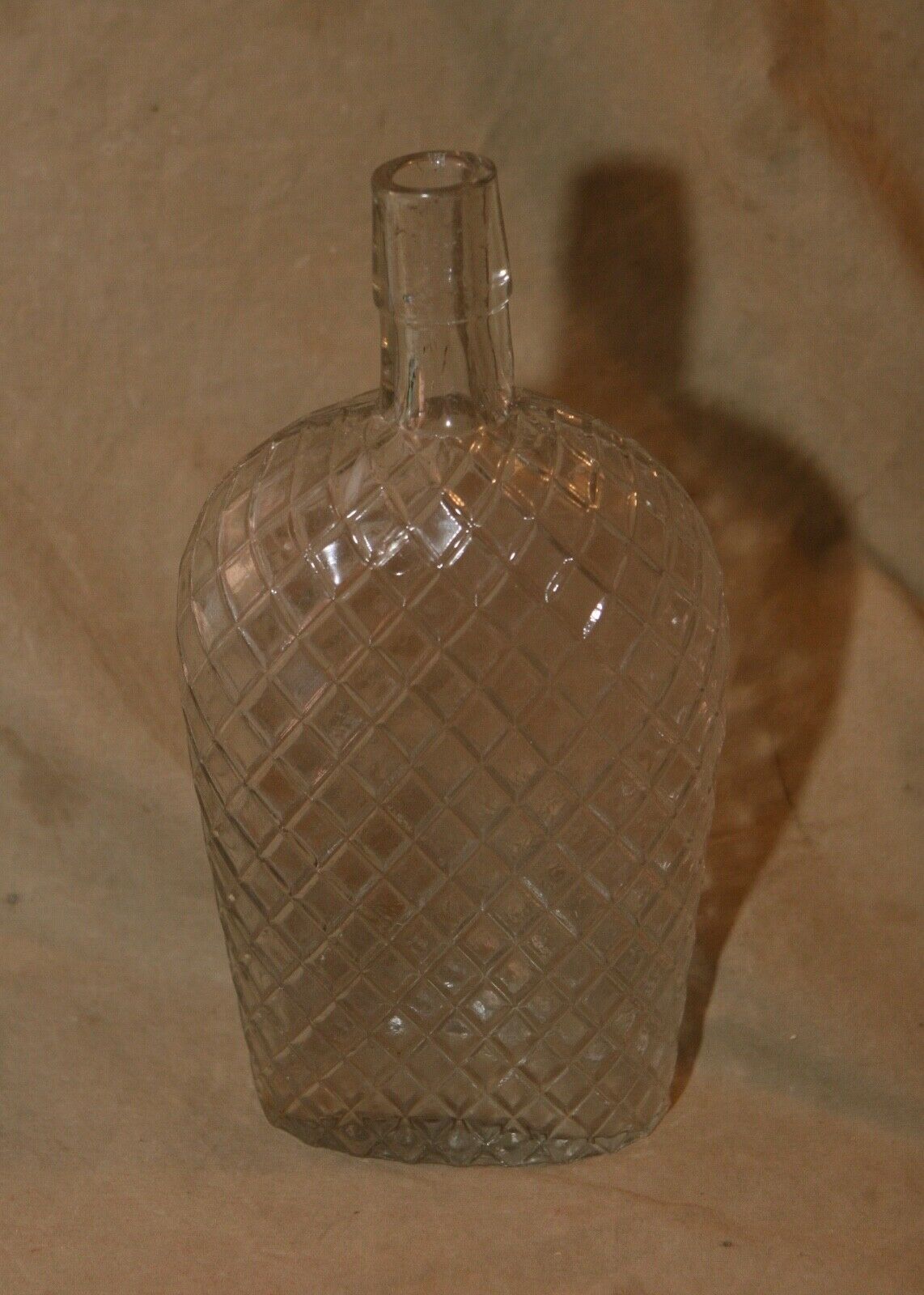 Title (ebay affiliate link): Antique Bottle 19th C Diamond Pattern Clear Glass Flask Shaped ~5x9.75"