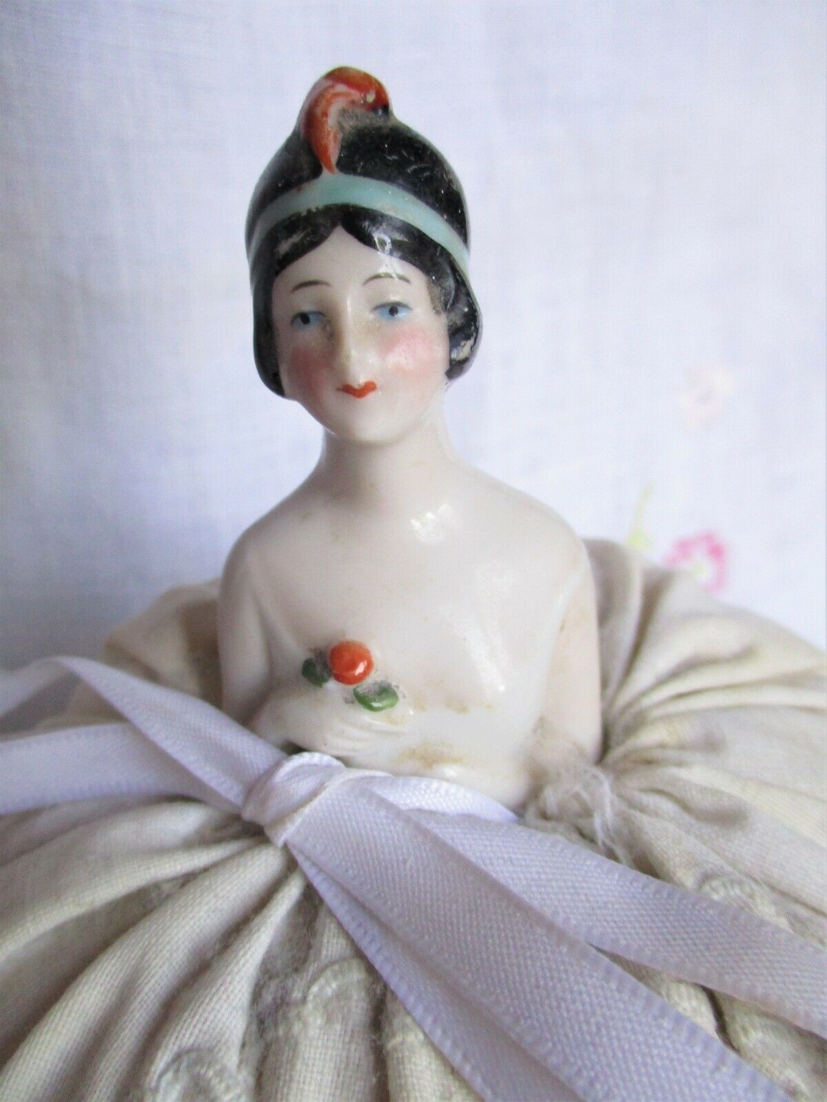 Title (ebay affiliate link): Antique Vintage ART DECO FLAPPER Porcelain half doll pincushion & Head