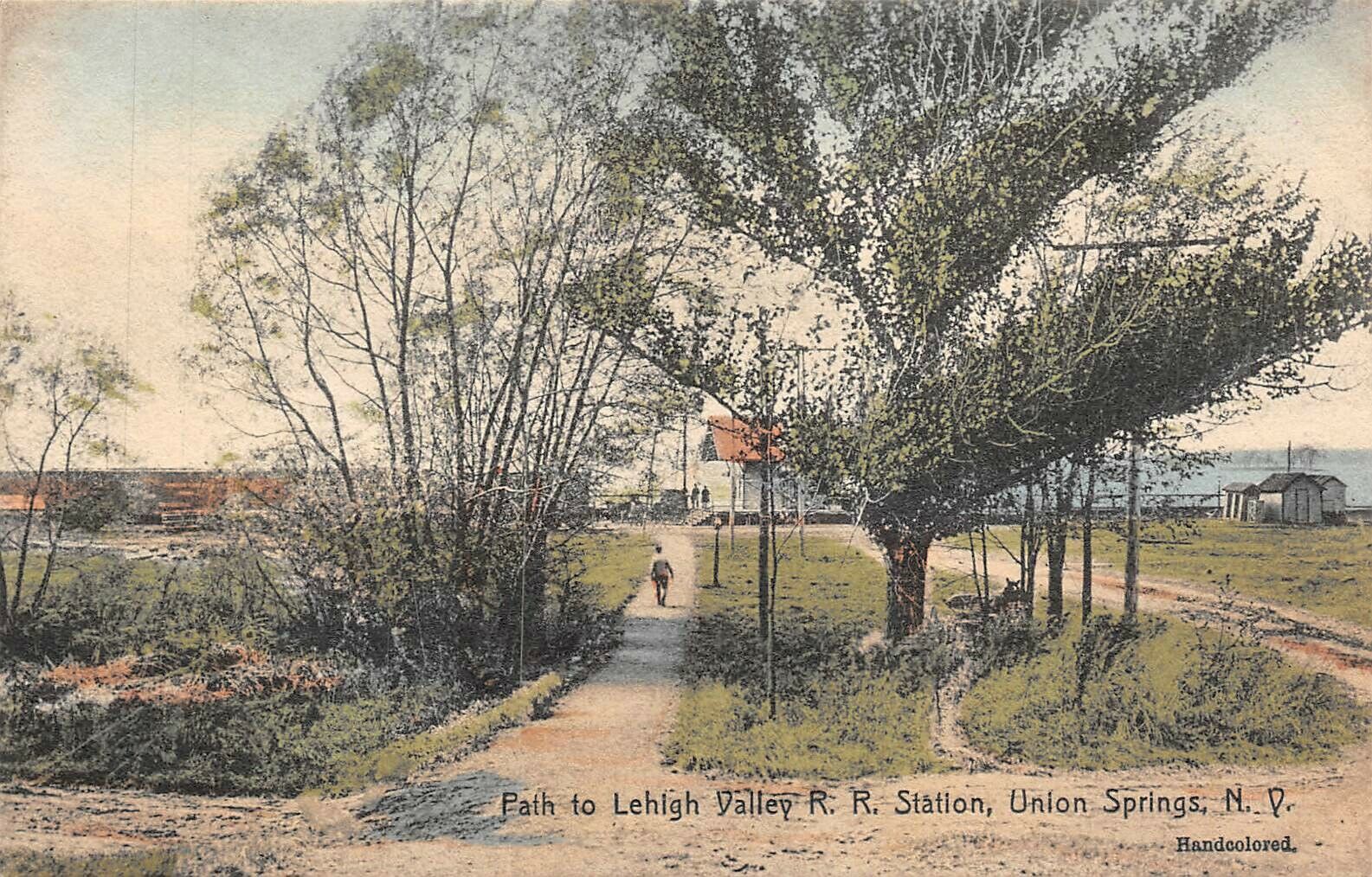 Title (ebay affiliate link): Union Springs, NY View of Railroad Station,Train & Tracks Thru a Path