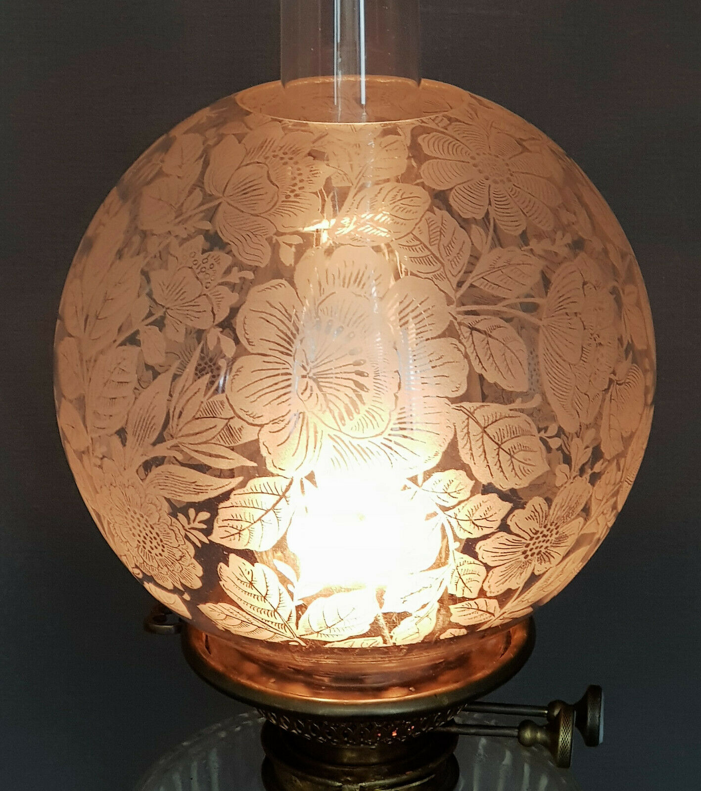 Victorian Floral Etched Kerosene Paraffin Duplex Oil Lamp Ball Shade Globe