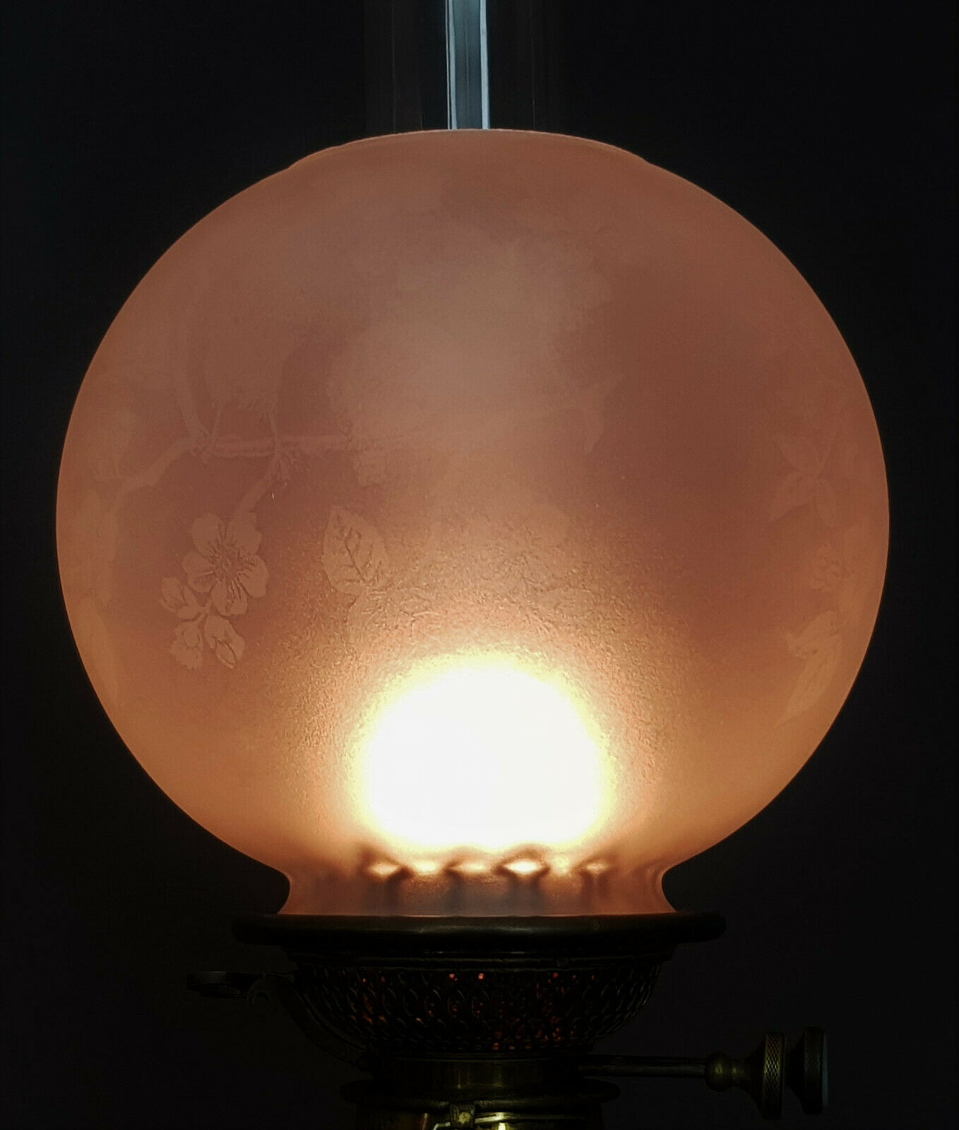 Victorian Etched Birds Kerosene Paraffin Duplex Oil Lamp Ball Shade Globe