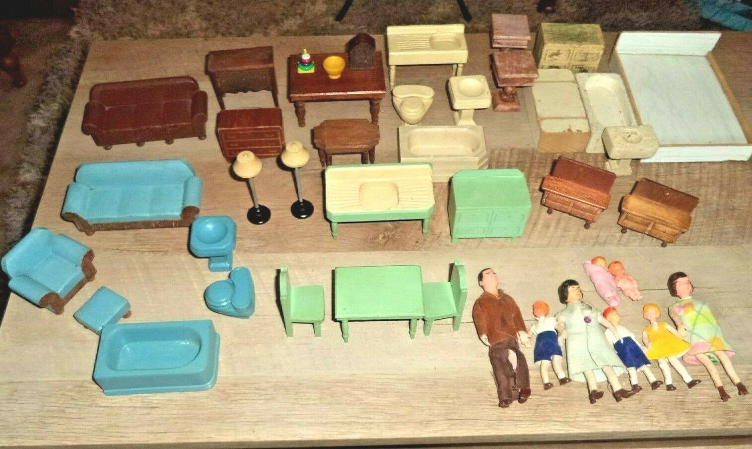 Title (ebay affiliate link): Vintage Lot of 36 Wood Dollhouse Furniture Pieces & 8 Doll Family in GUC