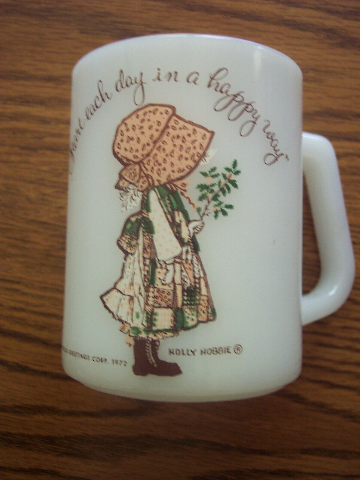 Title (ebay affiliate link): Vintage American Greetings Holly Hobbie 1972 White Milk Glass Mug Pink Hat