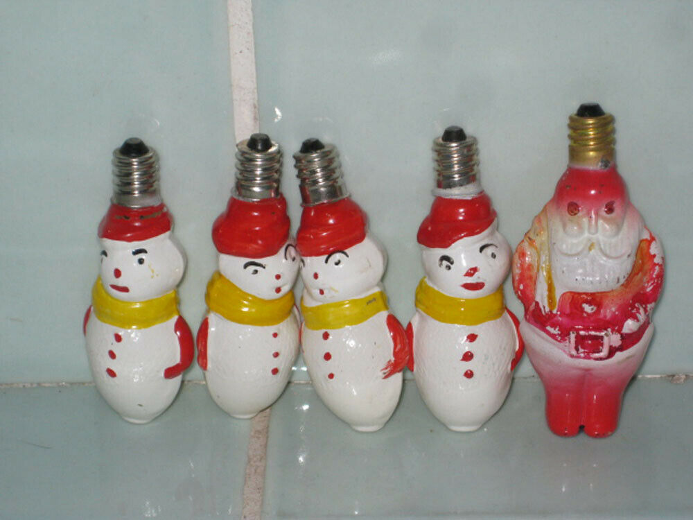 Title (ebay affiliate link): 4 Vintage Milk Glass Snowman C-7 Christmas Tree Light Bulbs + 1 Santa All Work