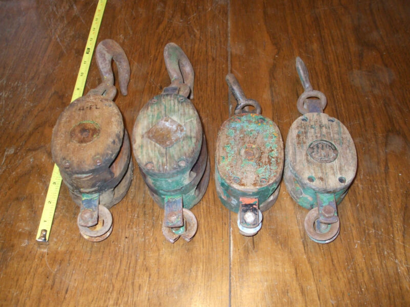 Title (ebay affiliate link): VINTAGE WOOD PULLEY, LOT OF 4, 2 SINGLES , 2 DOUBLES...FOR RESTORATION...