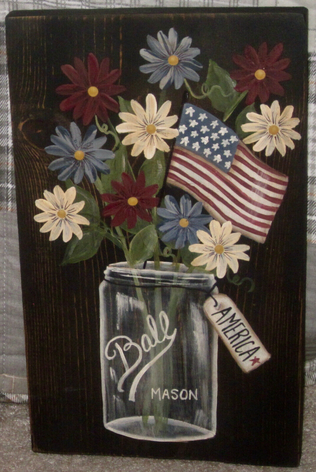 Title (ebay affiliate link): *~*PRIMITIVE*~* HP FOLK ART PRIM JAR * DAISIES * FLAG * AMERICA * RECLAIMED WOOD