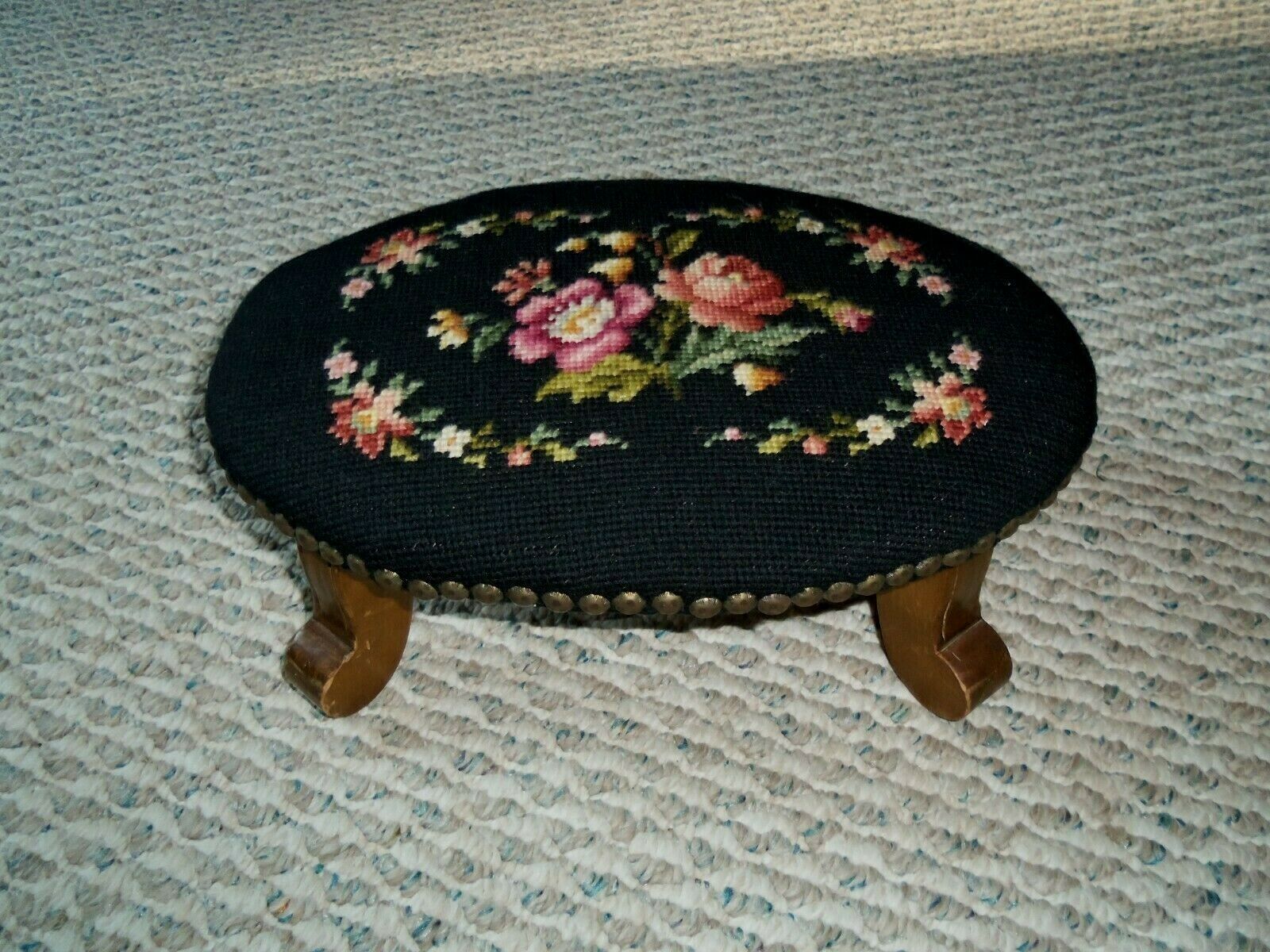 Title (ebay affiliate link): && SWEET VINTAGE ANTIQUE FLORAL FLOWERS NEEDLEPOINT OAK WOOD FOOT STOOL OTTOMAN